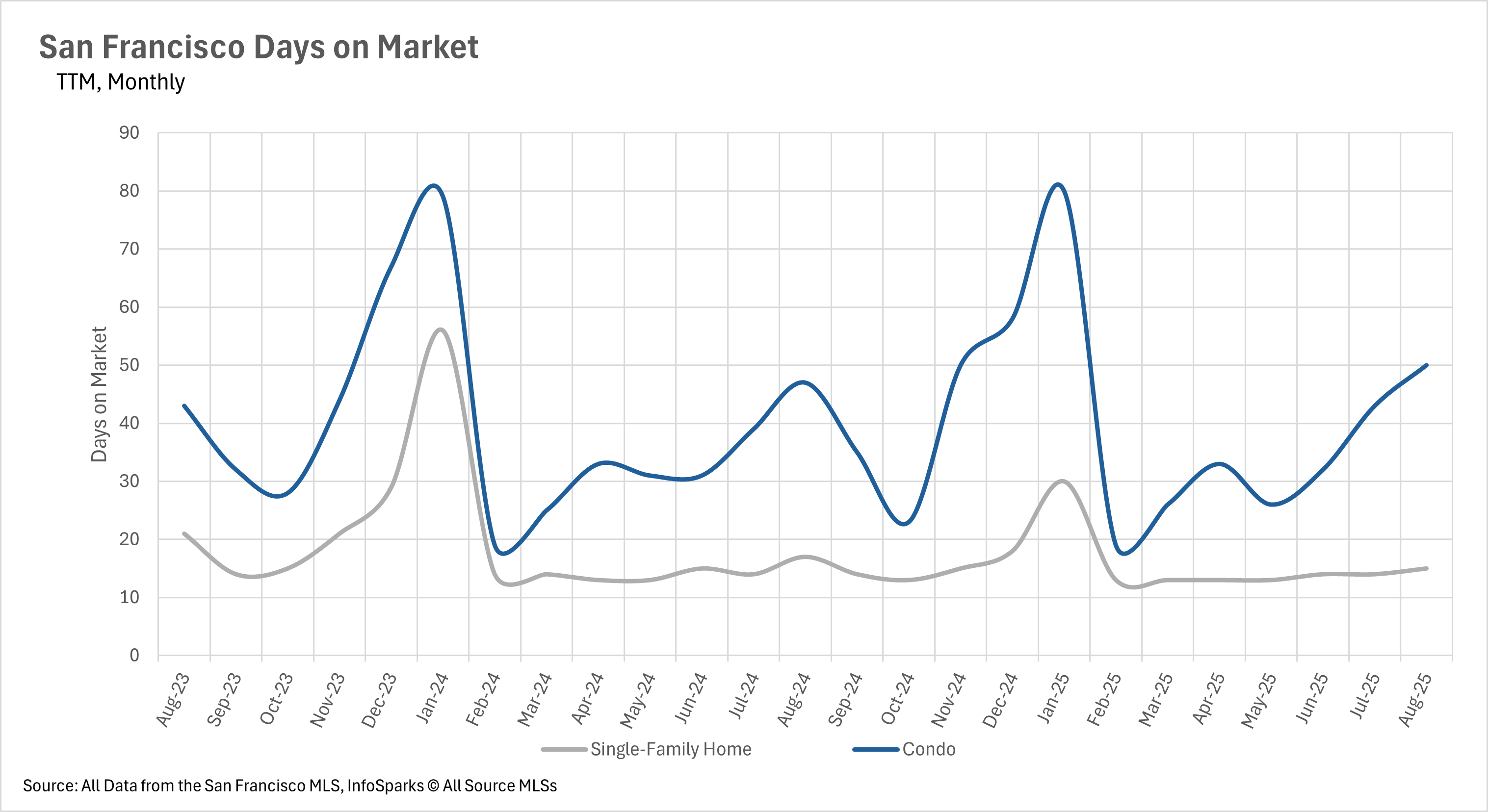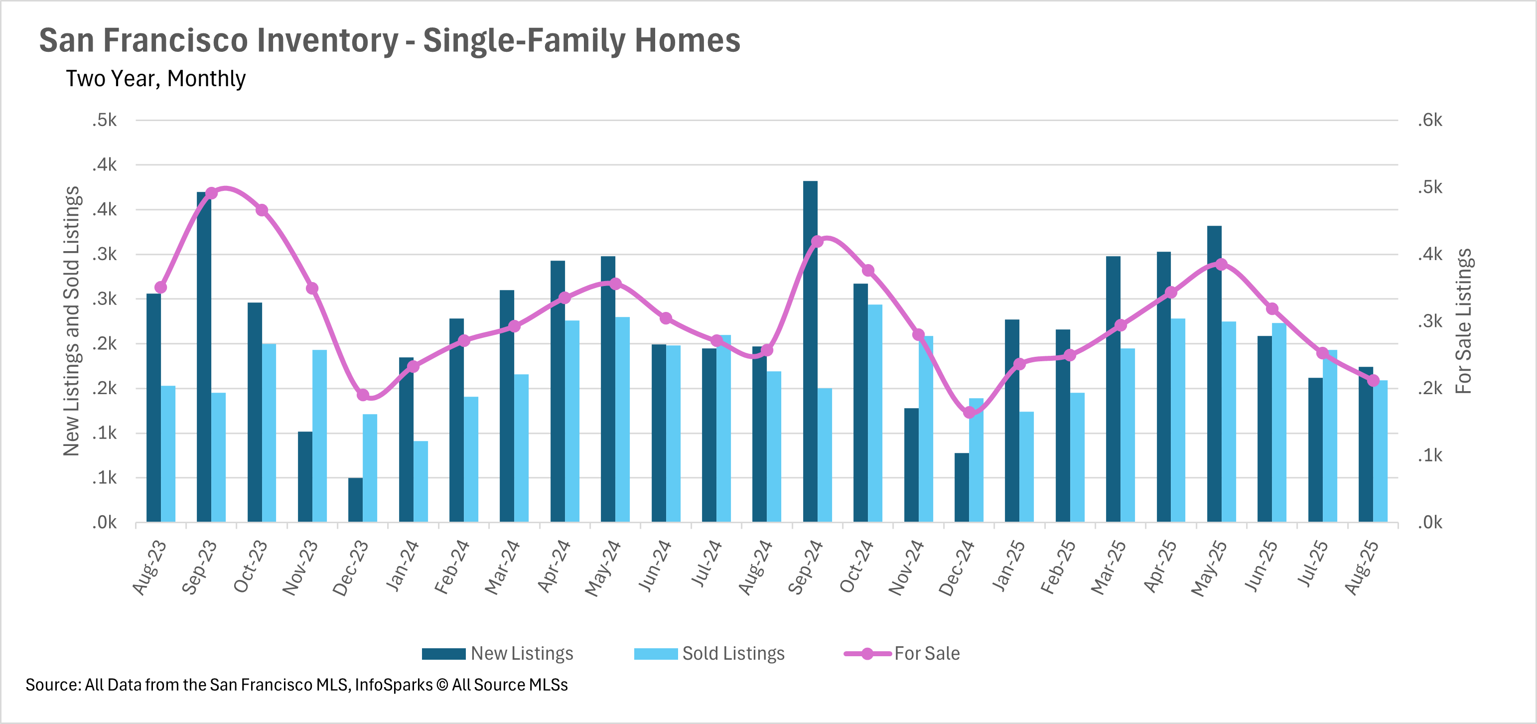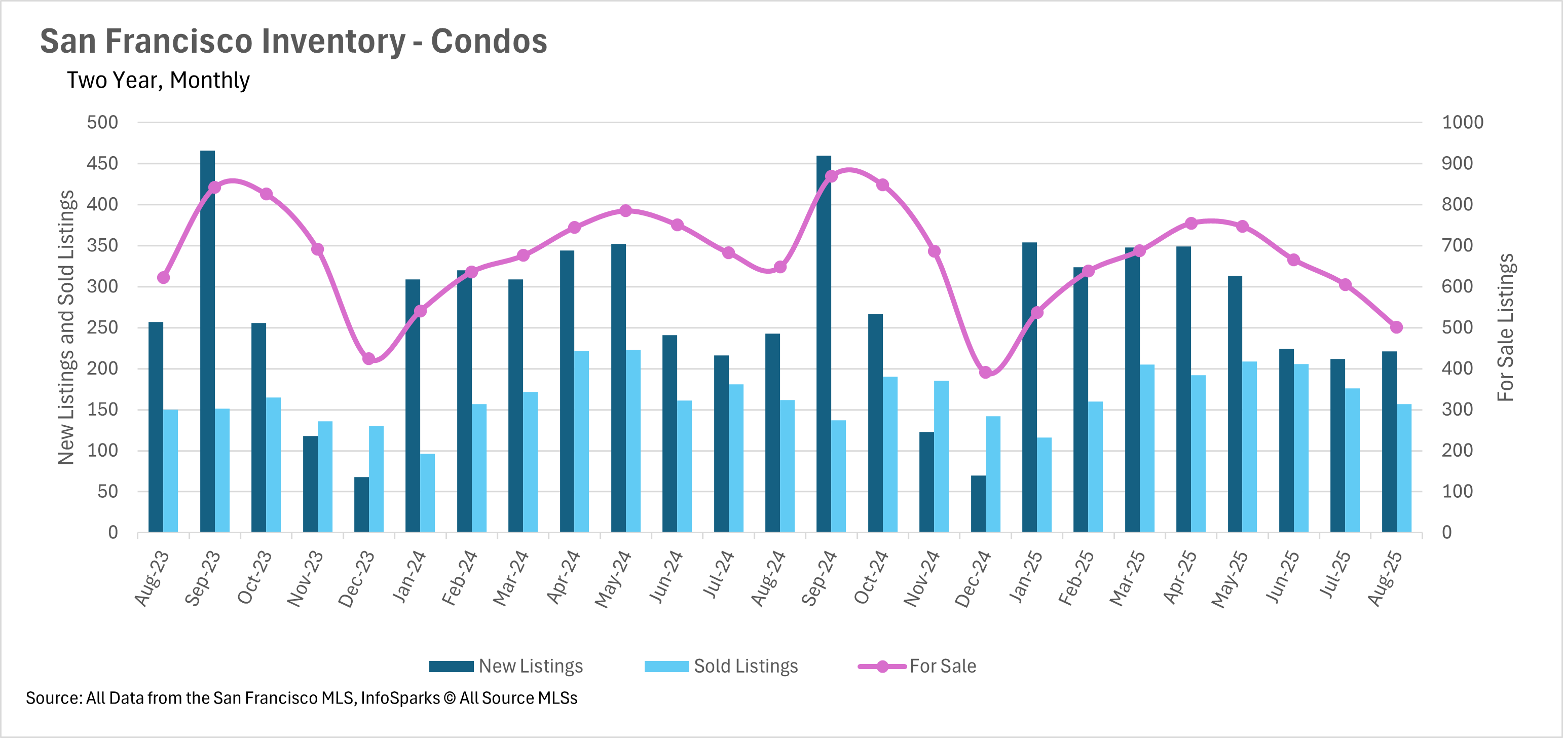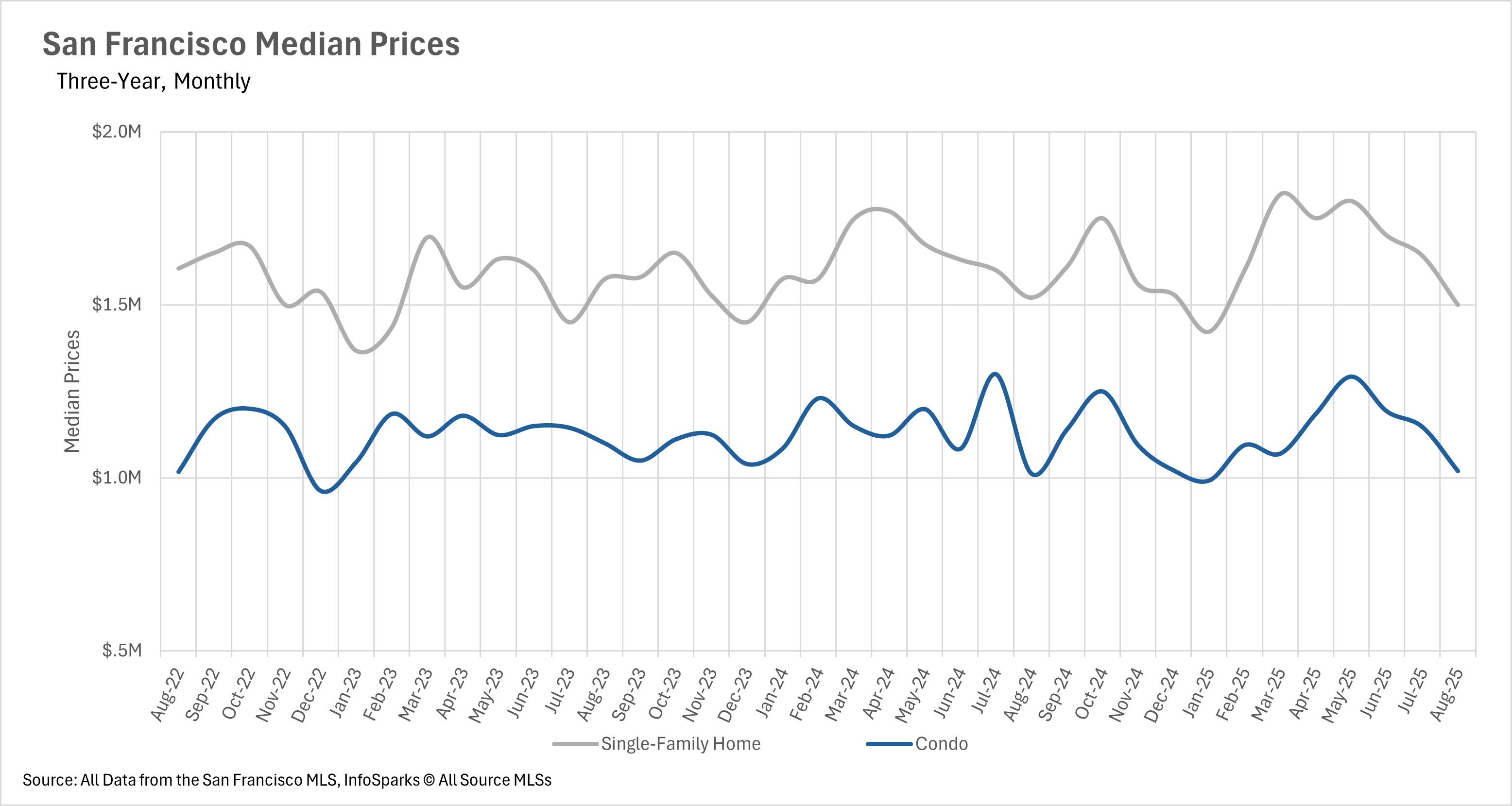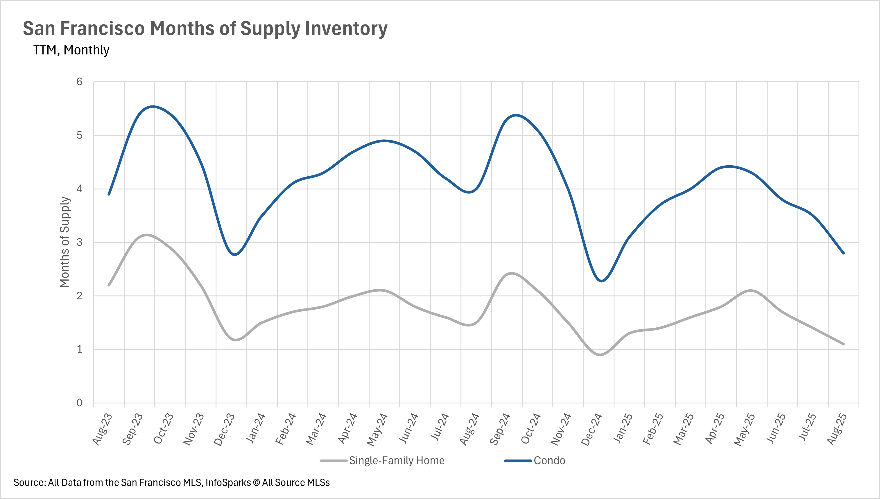 By Months of Supply of Inventory (MSI), balance is approximately 3 months. San Francisco is nowhere near that. August posted some of the lowest MSI readings on record: only 1.1 months for single-family homes and 2.8 months for condos, both in seller’s-market territory, with houses especially competitive.