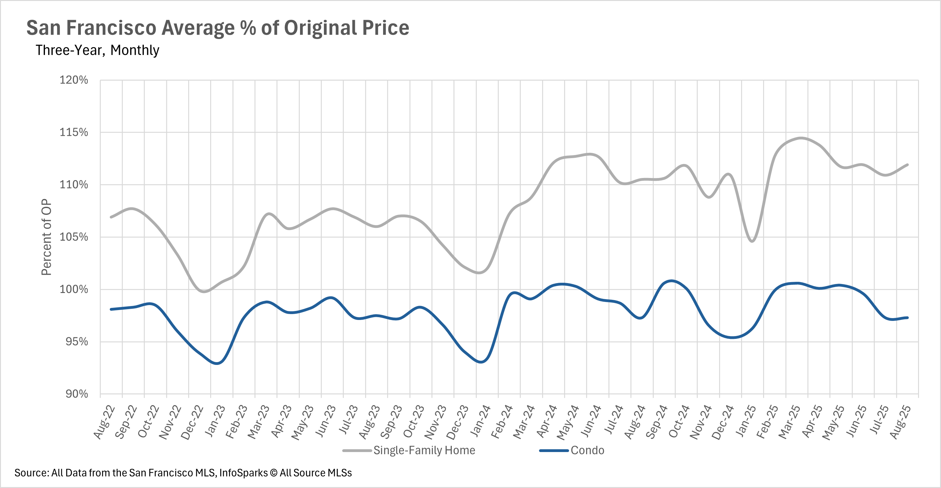 San Francisco’s housing market took a rare pause in August. Sales were basically flat with single-family homes down 1.38% year over year and condos up 0.74%, a notable shift from the 2-3%+ swings we’ve grown used to. The pricing split between product types remains clear: homes are still getting bid up (closing on average at 111.9% of original list), while condos are clearing closer to ask (97.3%). That points to stronger, urgency-driven demand for move-in-ready houses and more selective, value-oriented buying in the condo stack.